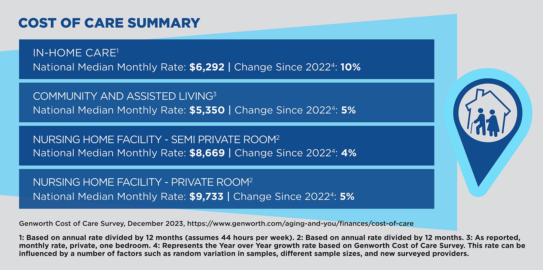 Reality: Only a few years of paying for professional long-term care can deplete hundreds of thousands of dollars of life savings. In the below Cost of Care Summary chart, you can review the cost of in-home care, community and assisted living, and nursing home facilities. The price varies between each option. You should evaluate the cost of care in several different types of facilities to make better informed decisions.