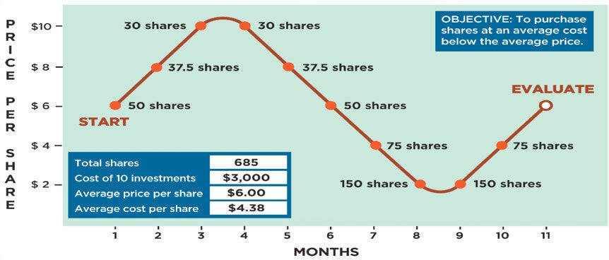 Notice how many more shares our hypothetical investor – we’ll call her Mary – buys when prices dip to $2 per share than when the price rises to $10 per share? The result, as you can see in the accompanying table, is that Mary’s average cost per share – $4.38 – is markedly lower than the average price per share – $6.00 – over the period in which she was investing.