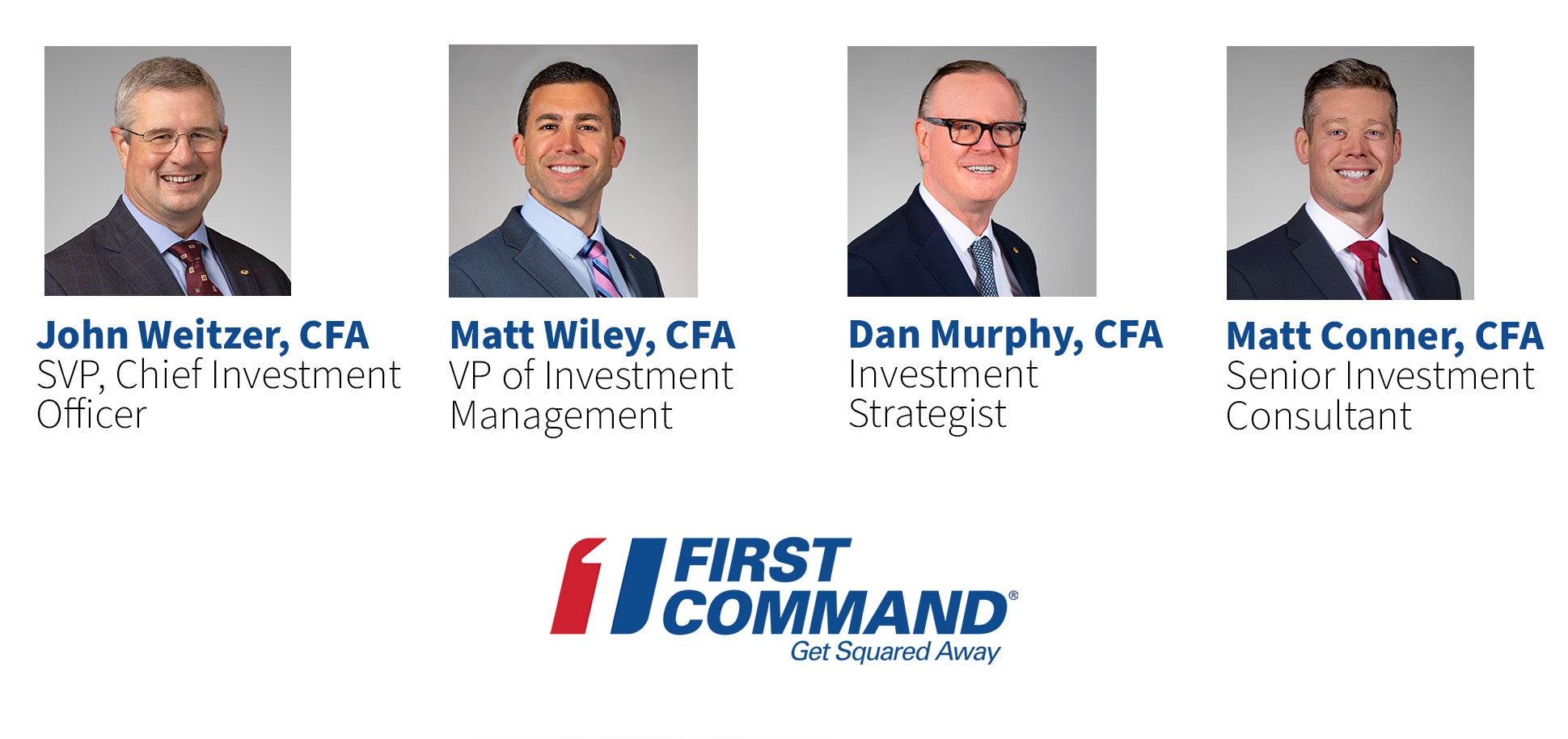 The information in this report was prepared by John Weitzer, CFA, Chief Investment Officer, Matt Wiley, CFA, Vice President of Investment Management, Dan Murphy, CFA, Investment Strategist, and Matt Conner, Senior Investment Consultant of First Command. Opinions represent First Command’s opinion as of the date of this report and are for general informational purposes only and are not intended to predict or guarantee the future performance of any individual advisor. All statistics quoted are as of the date of this publication, unless otherwise noted. First Command does not undertake to advise you of any change in its opinions or the information contained in this report. This report is not intended to be a client specific suitability analysis or recommendation, an offer to participate in any investment, or a recommendation to buy, hold or sell securities. Do not use this report as the sole basis for investment decisions. Do not select an asset class or investment product based on performance alone. Consider all relevant information, including your existing portfolio, investment objectives, risk tolerance, liquidity needs and investment time horizon. Should you require investment advice, please consult with your financial advisor. Risk is inherent in the market. Past performance does not guarantee future results. Your investment may be worth more or less than its original cost. Your investment returns will be affected by investment expenses, fees, taxes and other costs.