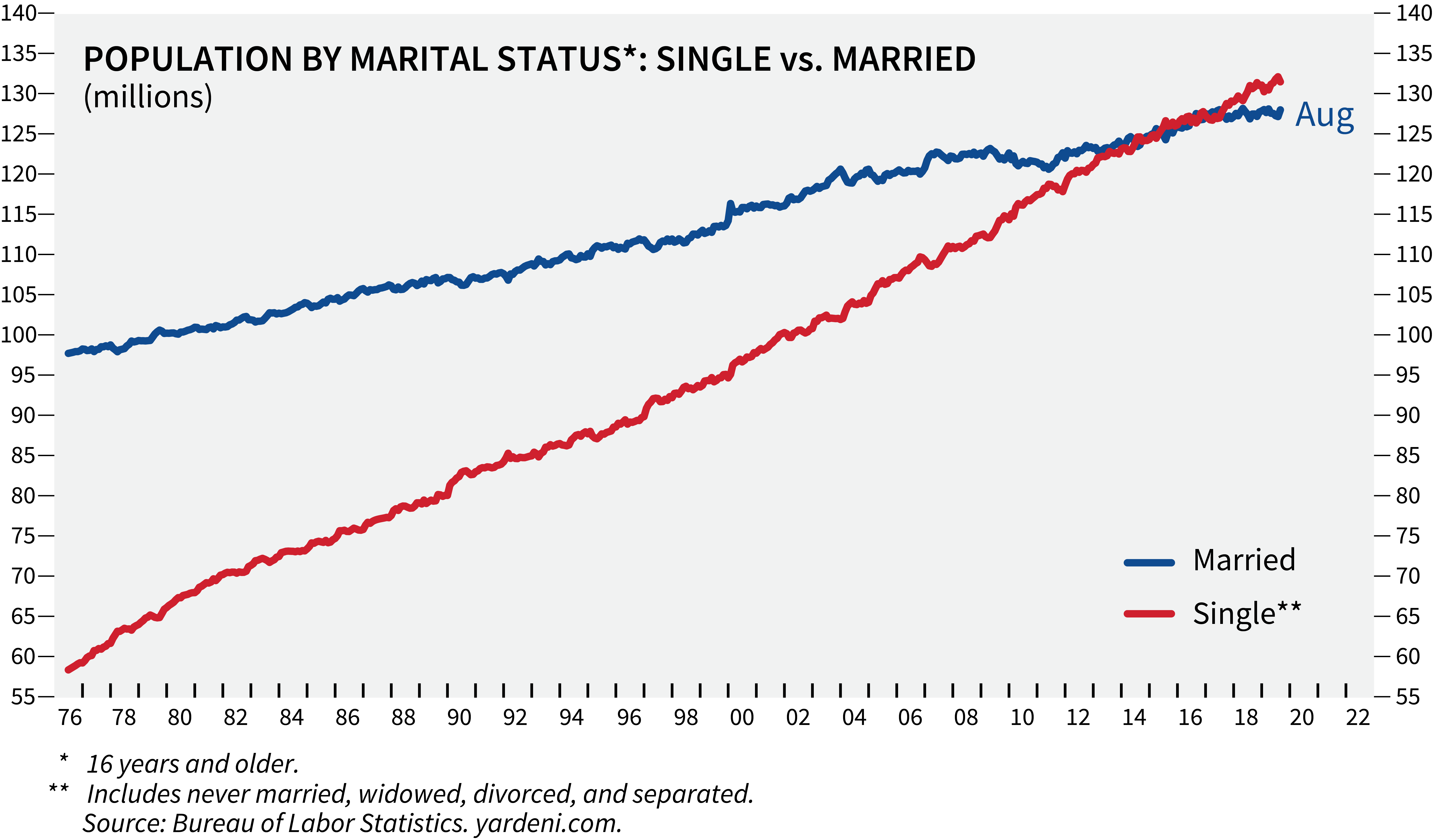 Many factors can influence household income, including age, industry, geography, household size, education, ethnicity and gender. Let’s focus on household size and age. On average, the more wage earners in a household, the higher the household income. Since the late 1970s, the growth rate of single people has outpaced the growth rate of married couples (see below chart). Today, single-person households outnumber married households. The rise in single households has very likely dampened household income growth.