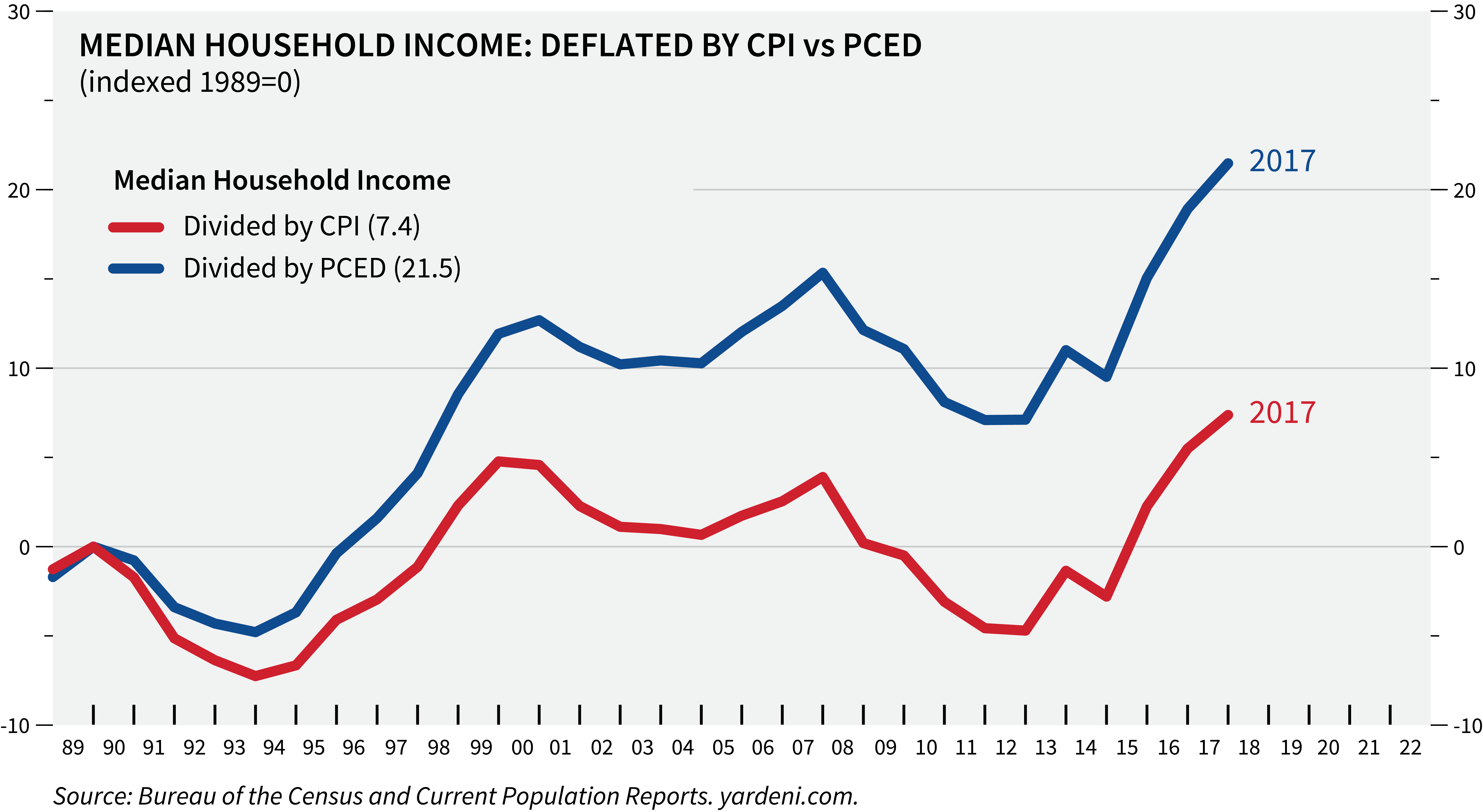 Since 2002, the CPI outpaced PCE by six percent (see chart above). This discrepancy makes a material difference in the household income real rate of growth. The chart below compares median household income using the CPI and PCE. When household Income is adjusted with the PCE instead of the CPI, real median household income shows a more robust 21.5 percent increase since 1989, weakening the wage stagnation argument. Not only does the growth in household income look better using PCE, it may be even greater than that for the following reasons.