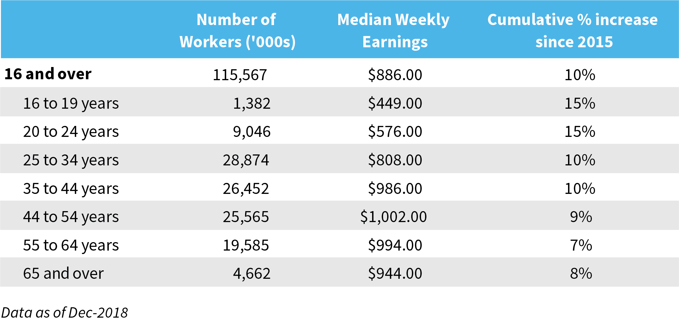 Age also impacts household income. Younger workers have higher wage growth, and older workers earn more. The table below shows the median weekly earnings by age group as of December 2018. Weekly earnings include basic pay, incentive pay, and premium pay for overtime and late-shift work.