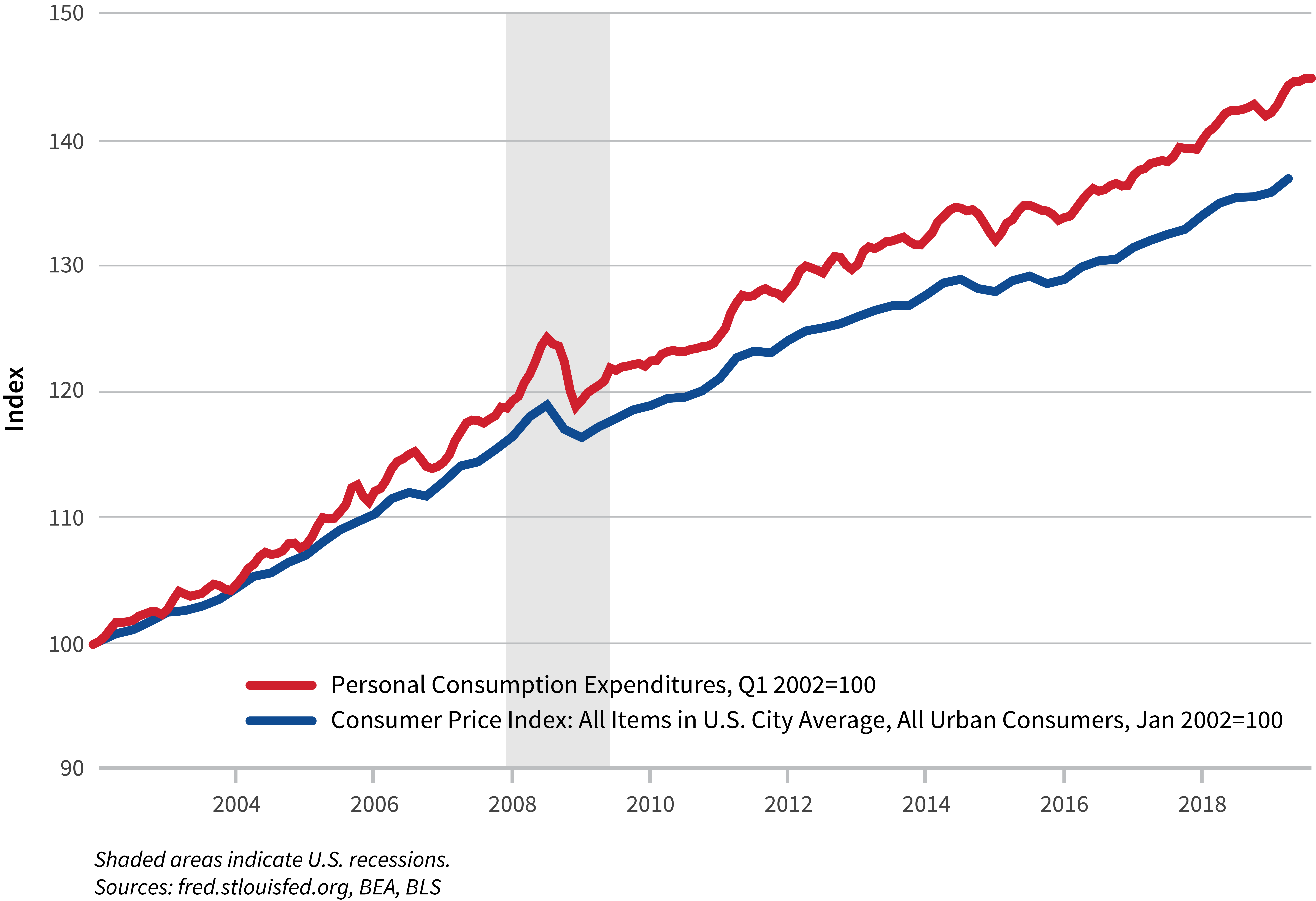 The PCE is a less-well-known deflator. The Federal Reserve Board, which establishes monetary policy, uses the PCE for evaluating the true pace of inflation. The PCE measures the price changes in goods and services that consumers actually purchase. By doing so, it reveals consumer shopping habits. Substantial price increases may cause consumers to buy less or shift to a similar, lower-cost product (think generic instead of brand name).