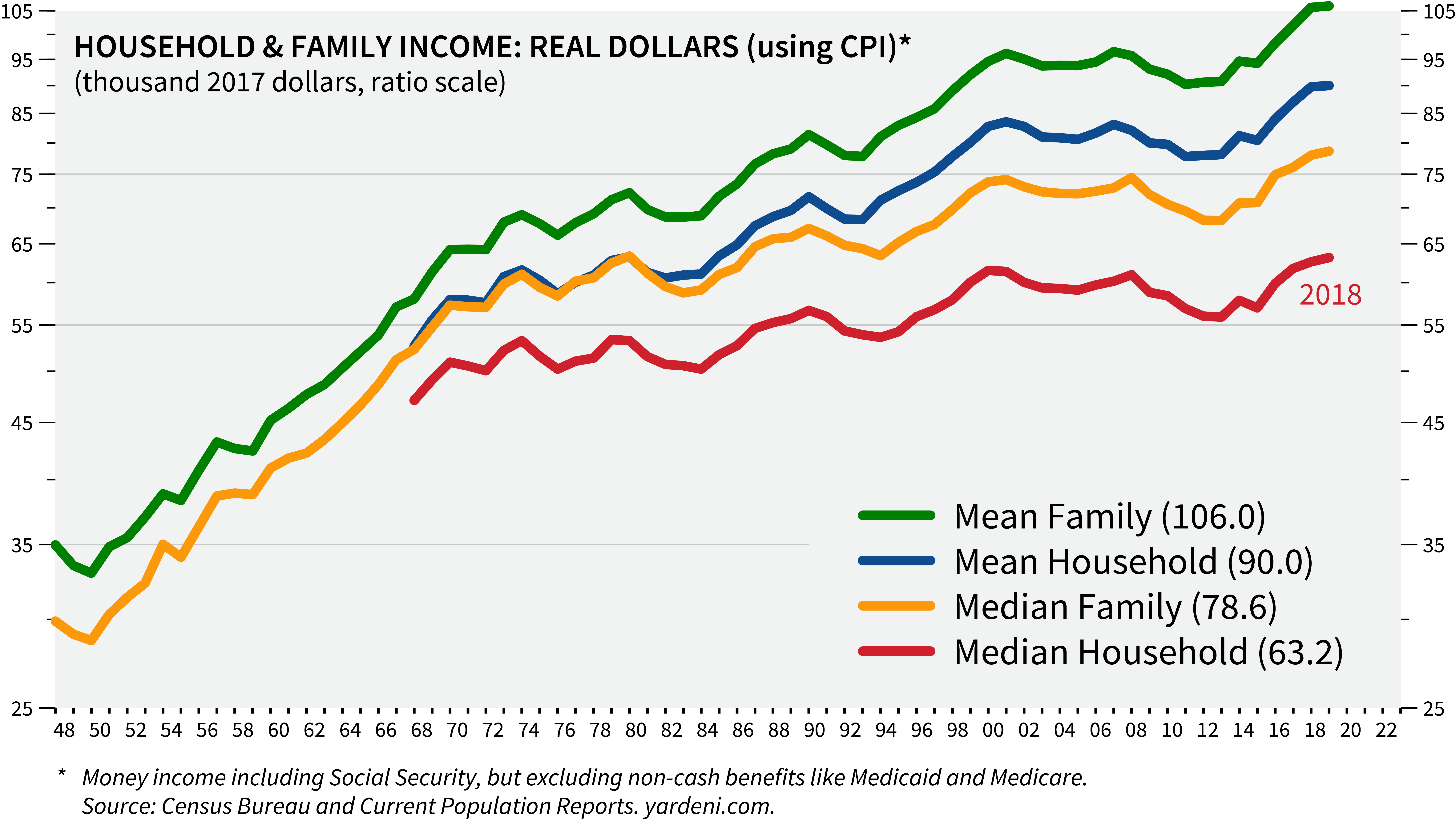 The chart below shows median and mean household and family income in real terms since 1948. Household income includes the income of all people 15 years and older living in a household. Median household income represents the income level earned by a given household where half of the households earn more, and half earn less. According to Yardeni Research, median household income increased a meager 7.4 percent in the 28 years between 1989 and 2017.