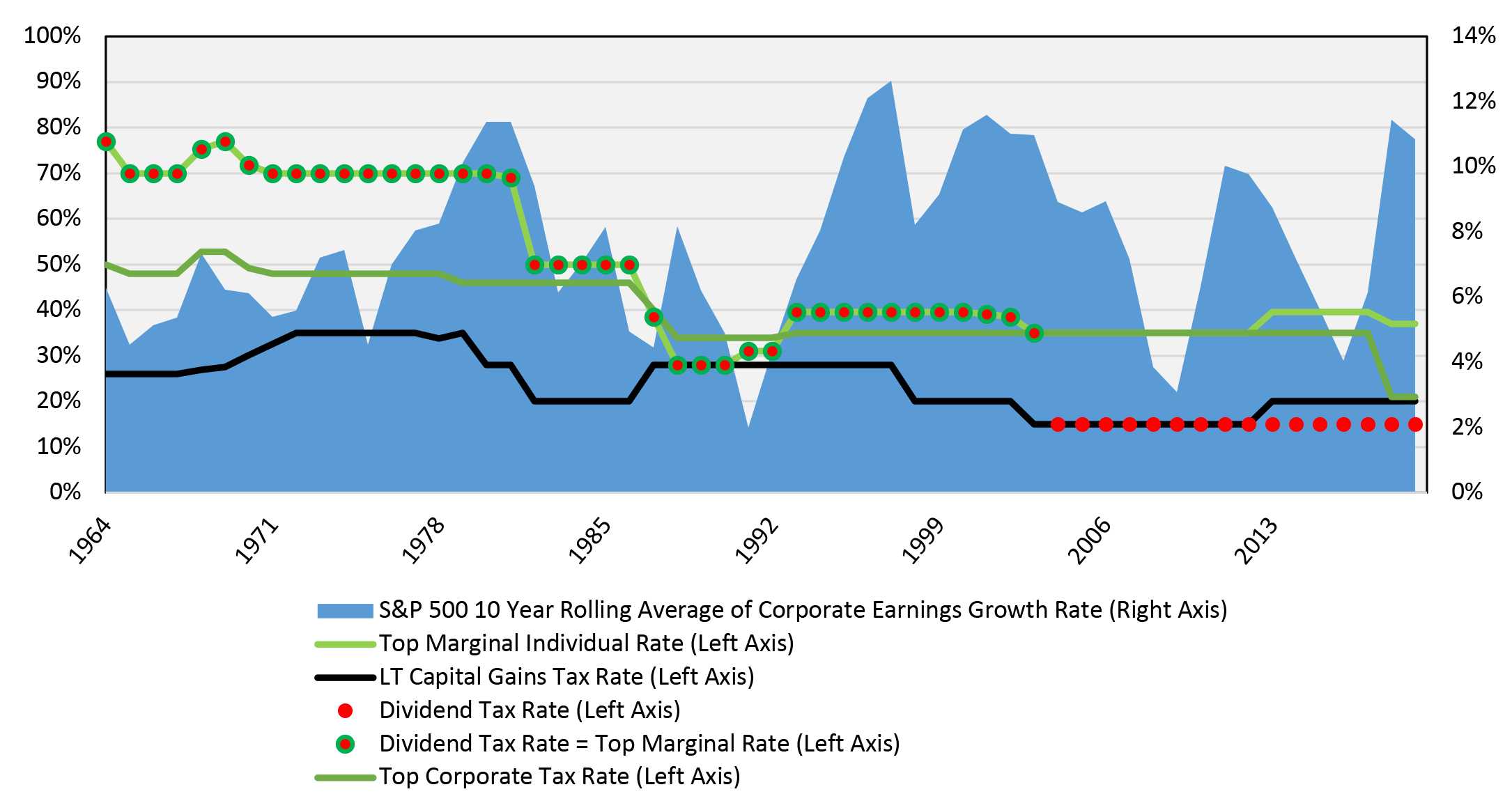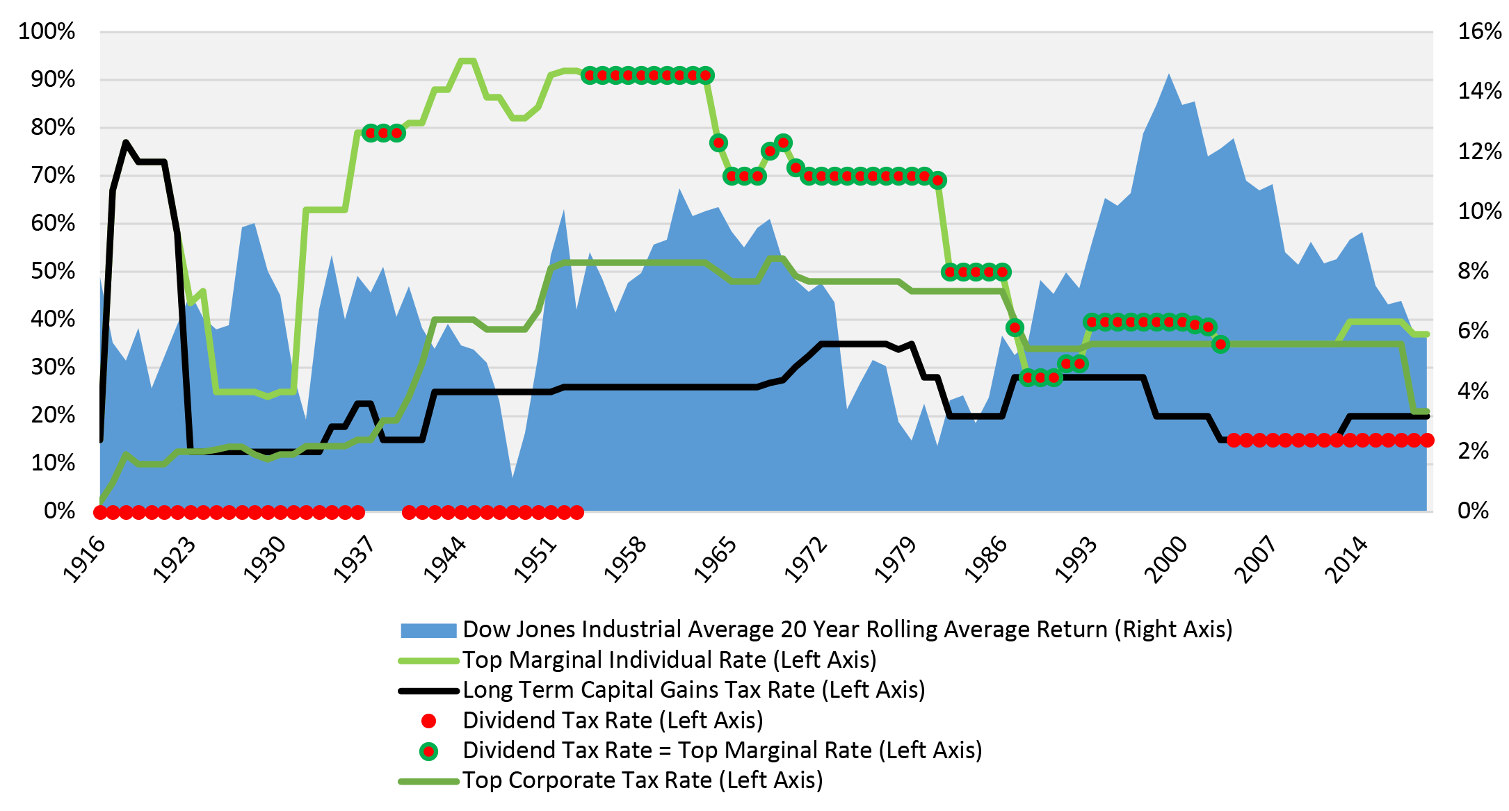 Information on tax rates was obtained from the following: Dividend Tax Rates (https://www.dividend.com/taxes/a-brief-history-of-dividend-tax-rates/), Capital Gains Rates (https://taxna.wolterskluwer.com/whole-ball-of-tax-2019/historical-capital-gain), Top Marginal Individual Rates (https://www.taxpolicycenter.org/statistics/historical-highest-marginal-income-tax-rates), Top Marginal Corporate Rates (https://www.taxpolicycenter.org/statistics/corporate-top-tax-rate-and-bracket).