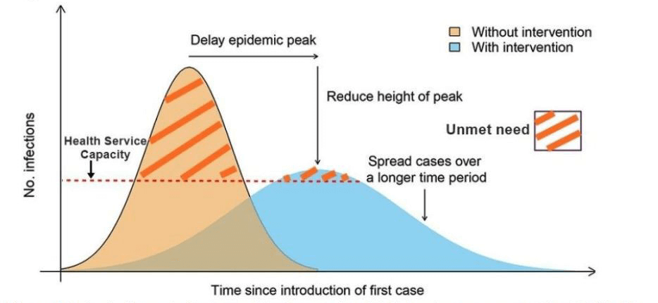 In the absence of a vaccine, each country is now using a strategy called “stretching.” This strategy includes using simple techniques to slow down the rate of infection – in essence, diversifying the disease’s impact over time. This is done through simple public health techniques like washing hands, practicing social distancing (especially with those that look ill), quarantines, school closings and avoiding large gatherings of people. This stretching strategy avoids a sharp peak in those infected. Why is that important? Because each country has a certain level of unused capacity in its medical system (used to treat severe cases) and if you can stretch out the disease over time and avoid a sharp peak, you can avoid overloading your medical system. If a country’s medical system gets swamped, you get triage and active decisions as to where to apply the limited medical resources. Italy is a prime example of a country with an overloaded medical system where reports indicate that they are not treating some elderly with pre-existing conditions. The chart below shows this strategy.