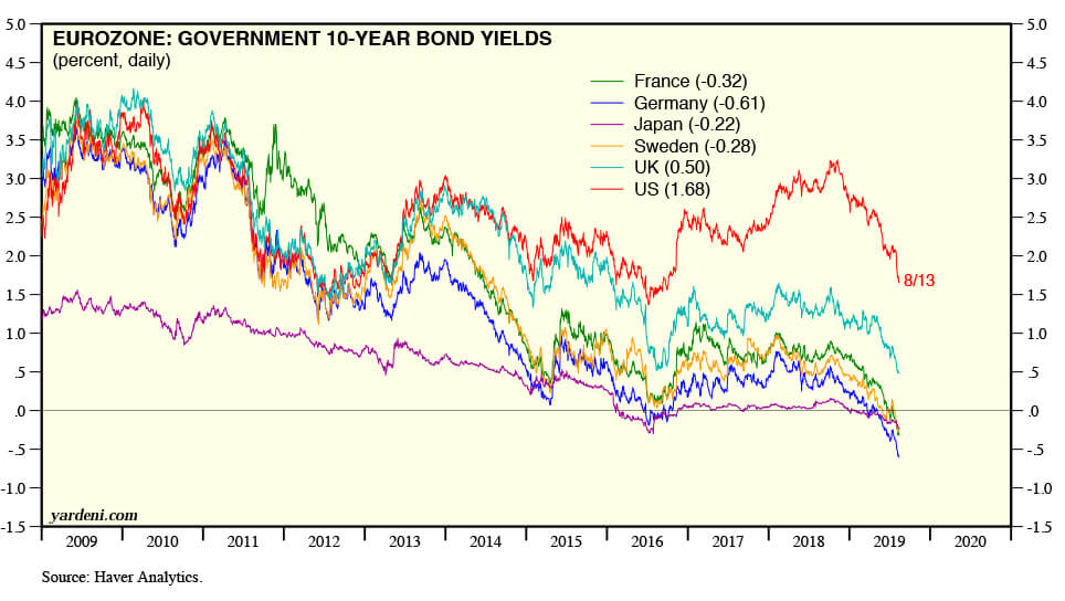 If an overheating economy, rising inflation, Fed intervention, and a credit crunch do not exist, what could be causing the inverted yield curve? Yardeni Research puts forth the following opinion. We now live in a globalized bond market and the behaviors of other central banks around the world affect us more significantly than in the past. The inversion of the yield curve seems to be attributable mostly to the negative interest rate policies of the European Central Bank (ECB), the Bank of Japan (BOJ), and others.[4] Examine the chart below.