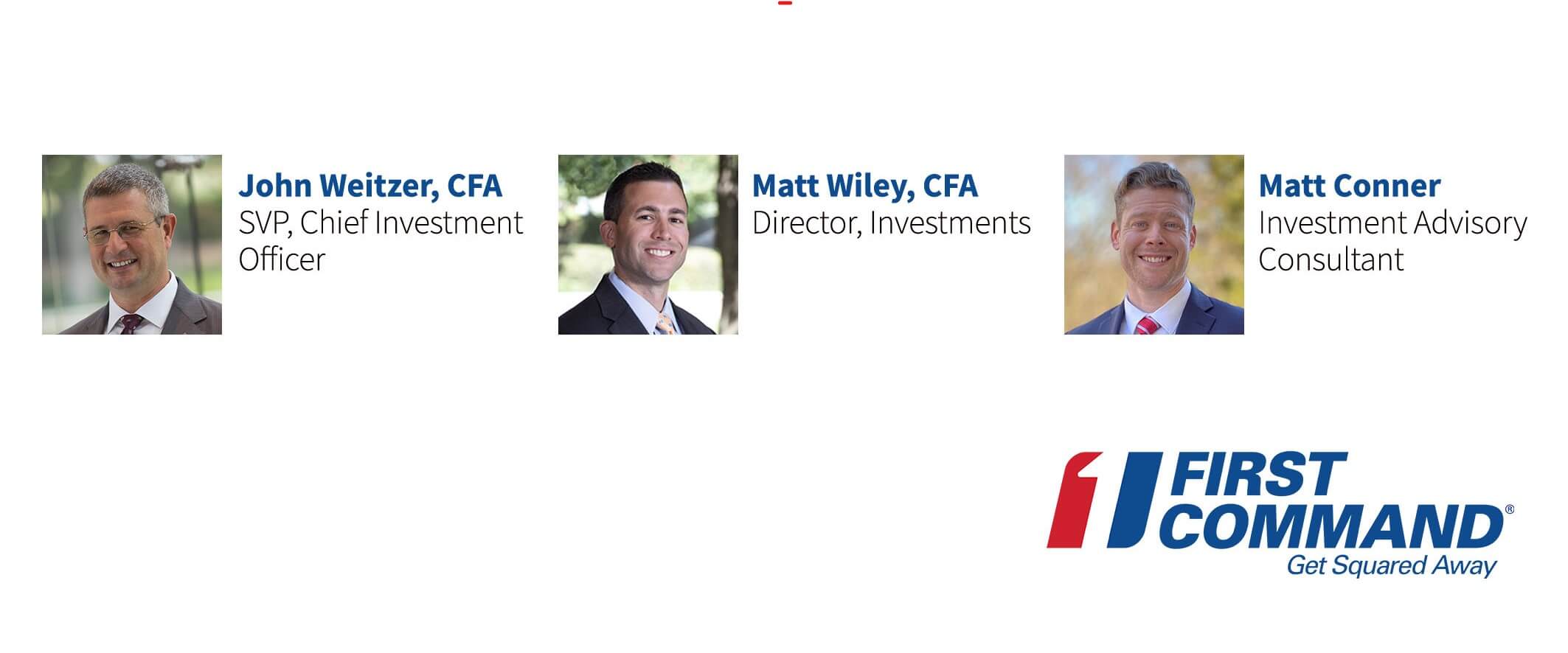 The information in this report was prepared by John Weitzer, Chief Investment Officer, Matt Wiley, Director Investment Management, and Matt Conner, Investment Advisory Consultant of First Command. Opinions represent First Command’s opinion as of the date of this report and are for general informational purposes only and are not intended to predict or guarantee the future performance of any individual advisor. All statistics quoted are as of the date of this publication, unless otherwise noted. First Command does not undertake to advise you of any change in its opinions or the information contained in this report. This report is not intended to be a client specific suitability analysis or recommendation, an offer to participate in any investment, or a recommendation to buy, hold or sell securities. Do not use this report as the sole basis for investment decisions. Do not select an asset class or investment product based on performance alone. Consider all relevant information, including your existing portfolio, investment objectives, risk tolerance, liquidity needs and investment time horizon. Should you require investment advice, please consult with your financial advisor. Risk is inherent in the market. Past performance does not guarantee future results. Your investment may be worth more or less than its original cost. Your investment returns will be affected by investment expenses, fees, taxes and other costs.